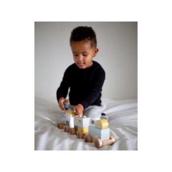 Ova prelijepa drvena igračka podstiče djecu da istražuju oblike, boje i životinje kroz slaganje i simboličnu igru. Vozić se sastoji od lokomotive i dvije vagone, a dijete može slagati i preslagivati blokove, razvijajući pritom koordinaciju, finu motoriku i logiku. Dizajn sa cirkuskim motivima, neutralnim bojama i simpatičnim ilustracijama životinja čini ovaj set i edukativnim i estetski dopadljivim dodatkom svakoj dječijoj sobi.