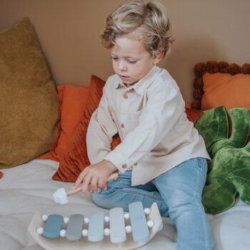 Ovaj elegantni ksilofon izrađen je od visokokvalitetnog FSC® certificiranog drveta i obojen sigurnim, vodenim bojama u toplim, smirujućim nijansama. Sa šest metalnih pločica koje proizvode nježne tonove i priloženom drvenom palicom, dijete može istraživati ritam, razvijati sluh i uživati u prvim muzičkim eksperimentima. Praktičan je, siguran i estetski predivan – idealan dodatak svakoj dječijoj sobi.